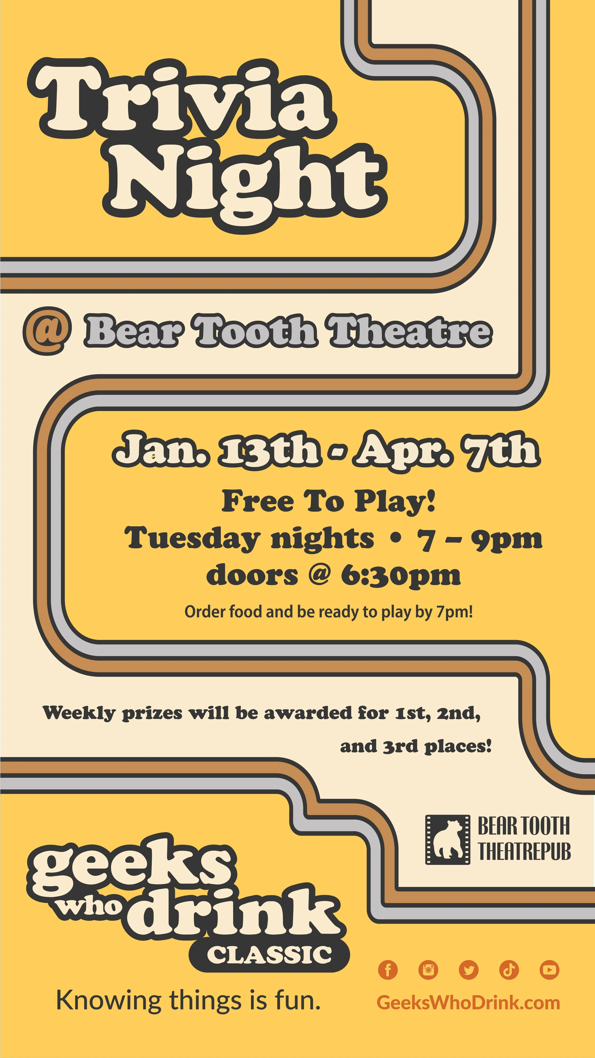 Starting January 13th and runs through April 7th. This weekly event is hosted by Geeks Who Drink. Doors open at 6:30pm, so grab some food, a beverage, and find your spot inside the theatre for a 7pm start time.